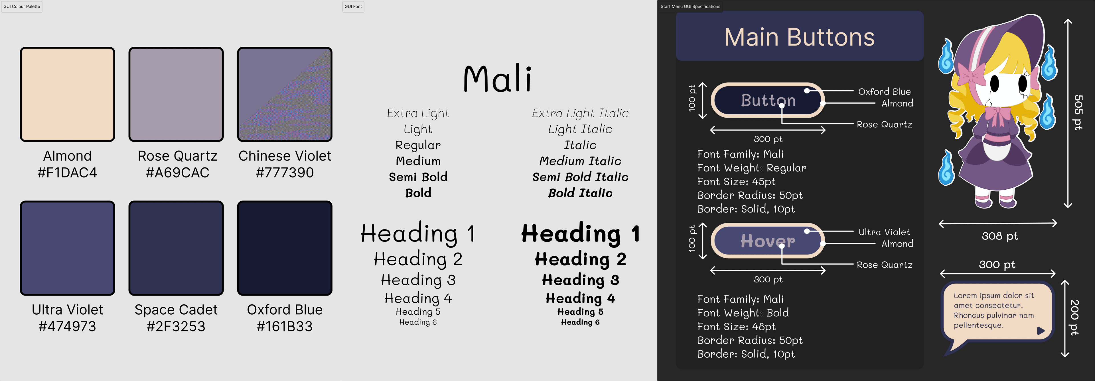 Goremet garners a light hearted and cute design, and we needed the game user interface to reflect that design. Therefore, we’ve decided to use vibrant tones of purple with the use of almond for contrast. Furthermore, we chose Mali as our type since it is quite legible and reflects the light hearted and cute style we envisioned for the game.